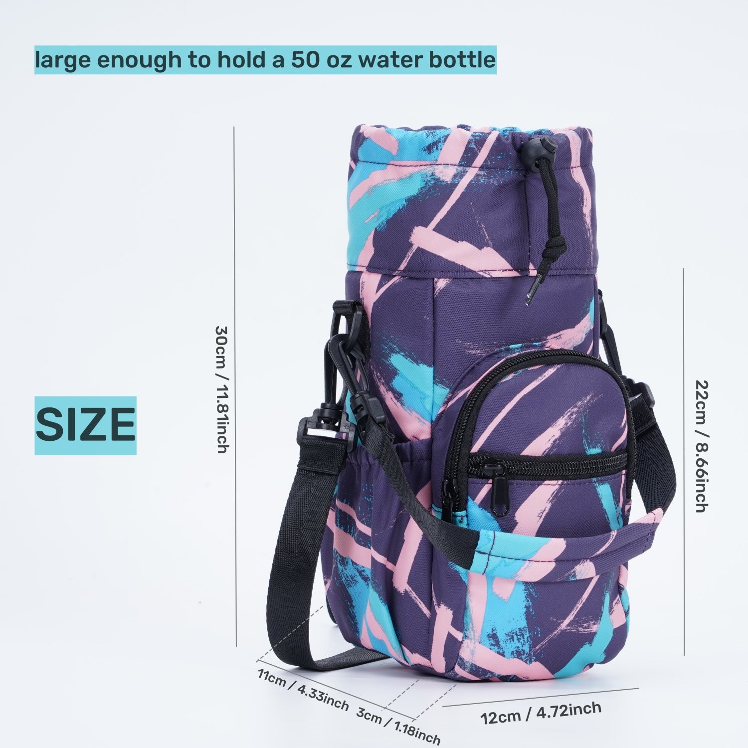 The water bottle carrier is large enough to hold a 50 oz water bottle