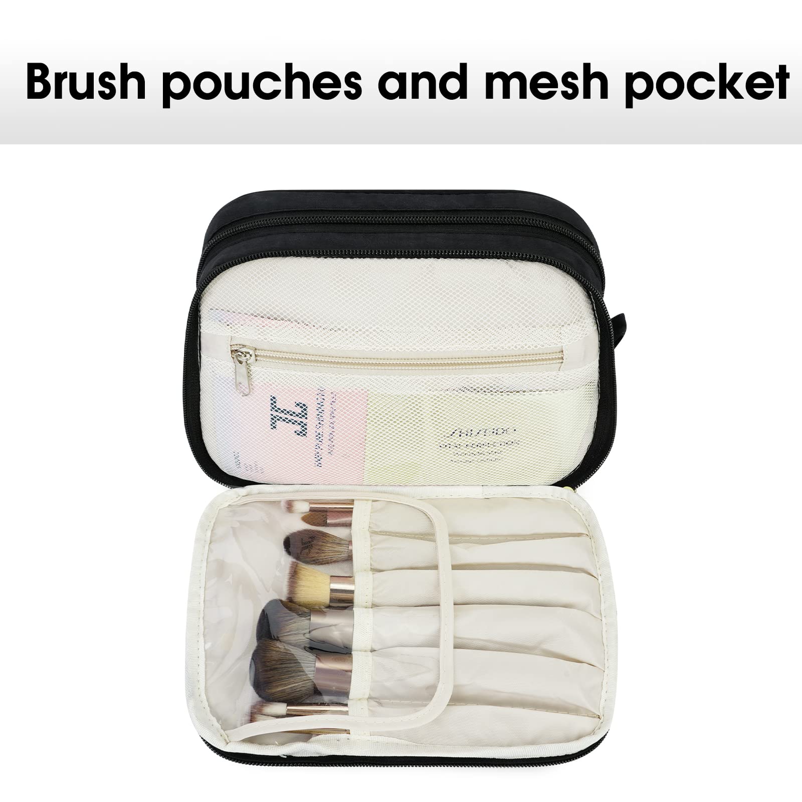 Separate Brushes Compartment & Front Zipper Pocket:WANDF travel makeup bag comes with separate brushes compartment to store your brushes, the PVC cover makes it stain-resistant and easy to clean. The mesh pocket and front zipper pocket is suitable to hold your small items.